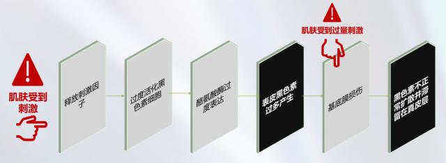 我们之所以会变黑,主要是因为皮肤受到刺激,就像多米诺骨牌效应刺激黑色素从表皮传递到真皮一样,倩碧所做的就是先稳定皮肤状态,防止变黑。