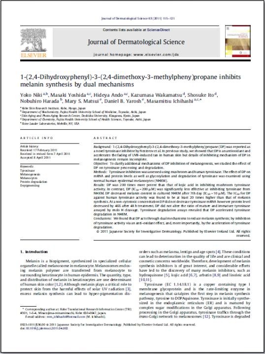 皮肤行业公认的顶级权威杂志《Journal of Dermatological Science》 曾发表关于 UP302(1- ( 2,4- 二羟苯基 ) -3- ( 2,4- 二甲氧基 -3- 甲苯 ) 关于丙烷美白机制的文章,觉得 UP302 不仅能使酪氨酸酶迅速失活,同时还利用其强大的抗氧化作用,减少和分裂黑色素的产生 [ 1 ] 。