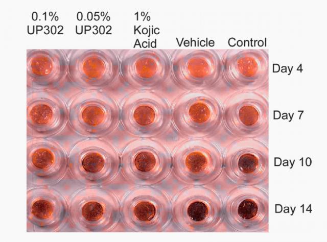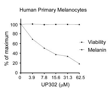 实验研究表明,原代人黑素细胞存在。 IC50 只有 8 μ mol/L,说明UP302 抑制黑色素生成的能力非常好。。