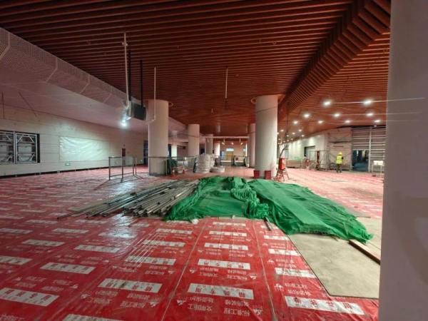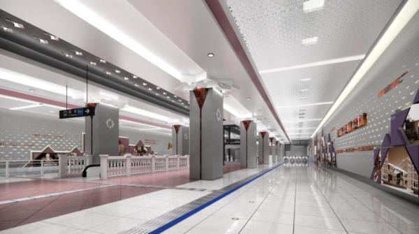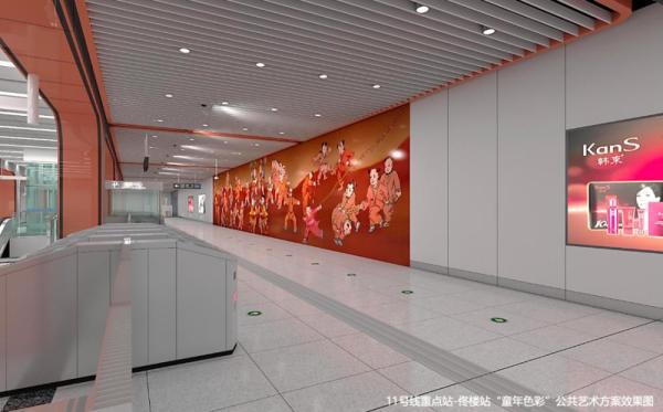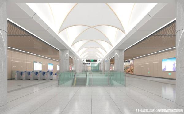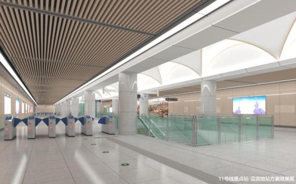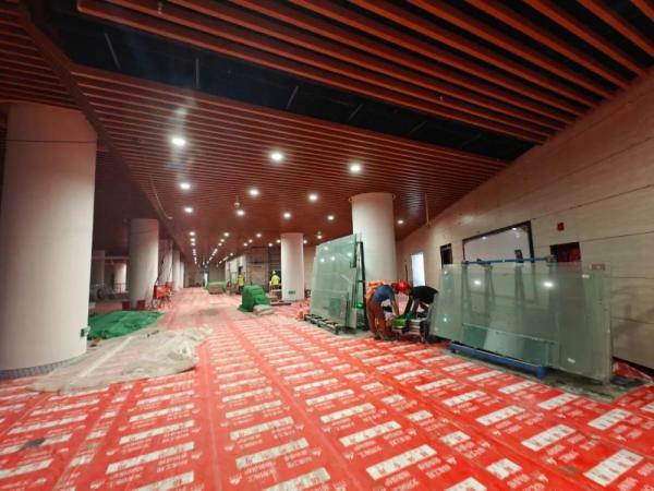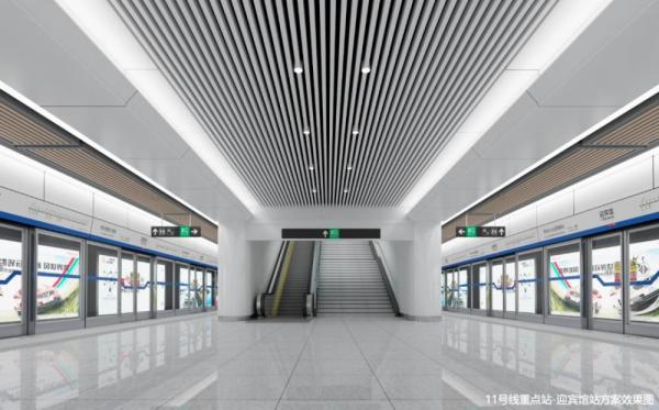 在地铁 11 号线文化中心站,展厅的天花板、柱子、地板已经安装完毕,工程师们正在加紧后续施工,车站整体装修工程已经完成。 85%。文化中心站作为一个特色车站,以“安静、悠闲、体验青春”为风格特色。地板采用三色地砖,设有 20 多米主题展示墙。