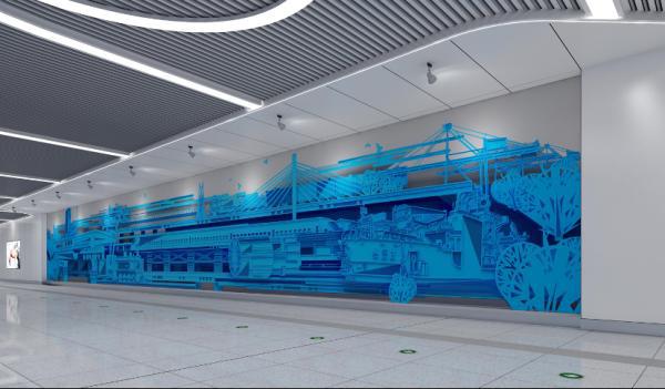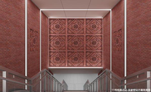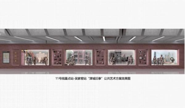 吴家窑站是 11 号线和 3 在号线的换乘站,车站将文化主题定位为天津记忆。通过在车站大厅公共区域设置“津城旧事”公共艺术品,在车站大厅楼梯端墙上设置砖雕作品。