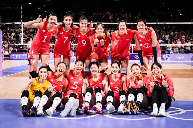在巴黎奥运会击败法国女排之后,中国女排合影。