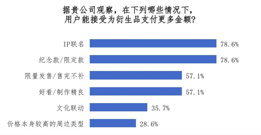 产品长线运营的过程中,为了扩大影响力,搞各种联名联动已经是常态,从企业侧的反馈来看,IP联名、纪念款/限定款是较多企业认可的方式,均有近8成企业选择。