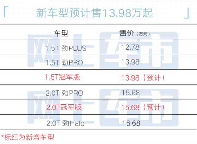 1.5T 冠军版在 1.5T 劲 Pro 升级电动尾门的基础,15.4 英寸中控屏幕(这个模型 12.8 英尺)、前排座椅通风,50W 手机无线充电;2.0T 冠军版在 2.0T 劲 Pro 升级电动尾门的基础,15.4 英寸中控屏幕(这个模型 12.8 英尺)、前排座椅通风,50W 移动电话无线充电,19 锻造轮毂的英尺 / 车胎。