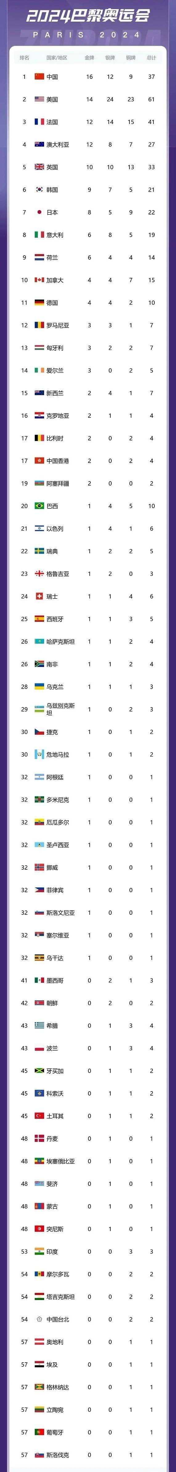 到目前为止,中国代表团以 16 金 12 银 9 铜共 37 一枚奖牌在金牌榜上名列前茅。