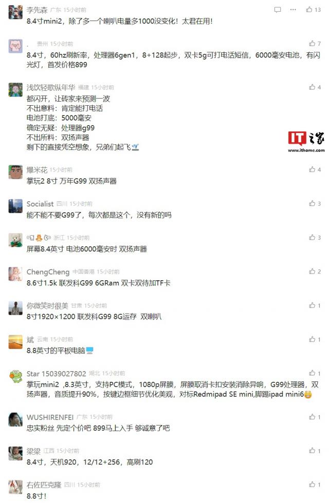 现在官方还没有公布更多关于新产品平板的信息,但是已经开放了竞猜活动。有网友在评论区留言猜测:新品为 8.4 配备MTK的英尺上下超小平板 G99 Cpu。
