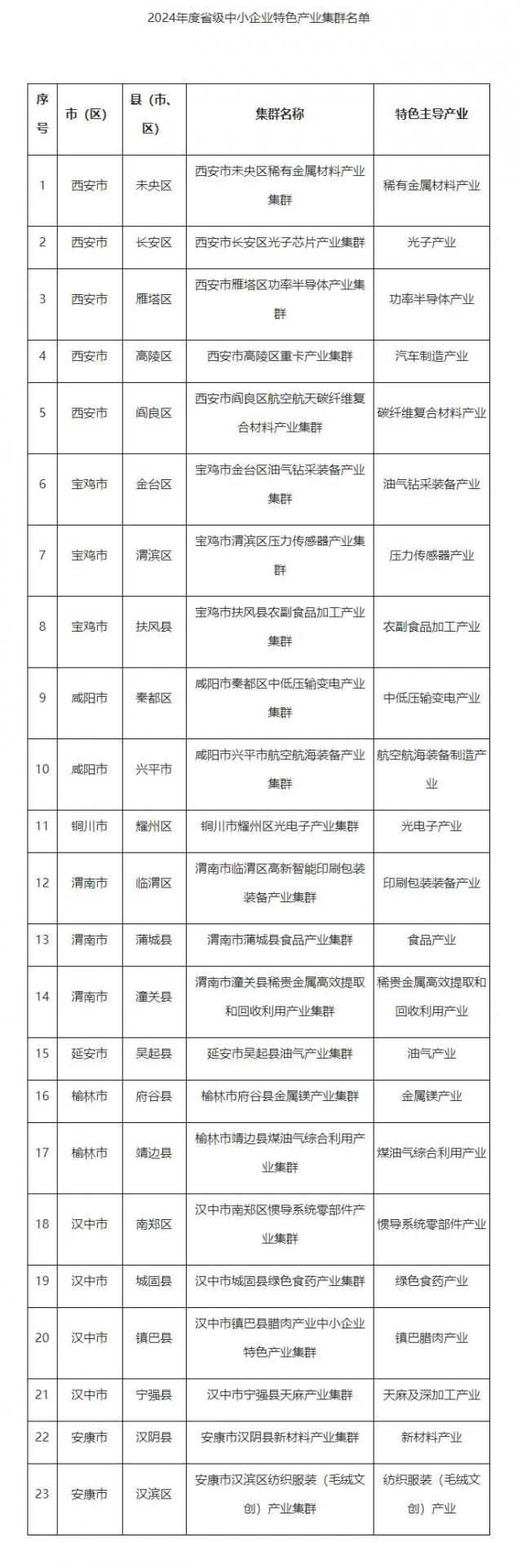 此次我省新增的 23 西安市、宝鸡市、咸阳市、渭南市、铜川市、延安市、榆林市、汉中市、安康市分布有个中小企业特色产业群。。