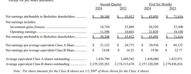财报显示,2024 2008年第二季度,公司收入 936.53 去年同期为亿美元 925.03 市场预测,亿美元 910.9 一亿美元;净利润 303.5 十亿美元(约合人民币) 2173.15 亿元),去年同期为 359.12 市场预测,亿美元 177.86 亿美金。2024 今年上半年,伯克希尔的净利润总额达到 430.5 去年同期为亿美元 714.16 亿美金。