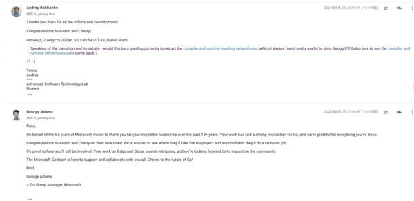 接任者 Austin Clements 自 2014 从2008年开始在谷歌工作 Go 语言工作,而原因 Clements 负责的 "Go 核心 " 技术工作将由 Cherry Mui 接管。