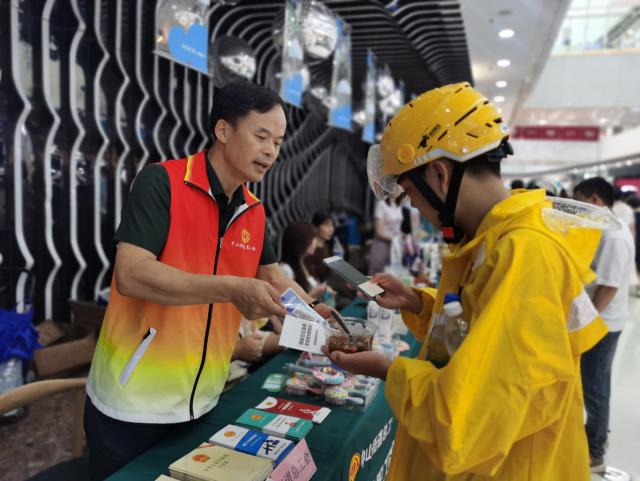 在便民服务区,中山市场监管所、厦门国际银行松江支行的工作人员为新业态、新就业群体提供食品安全咨询、金融反诈骗宣传等志愿服务。 · 松江中山社区工作人员为新就业群体提供入住条件及相关细节咨询。凉粉和绿豆粥是在凉爽区精心准备的,可以缓解外卖人员的暑热。