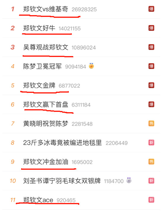 朋友圈刷屏,热搜持续,微博前11个热搜7个是关于郑钦文的。