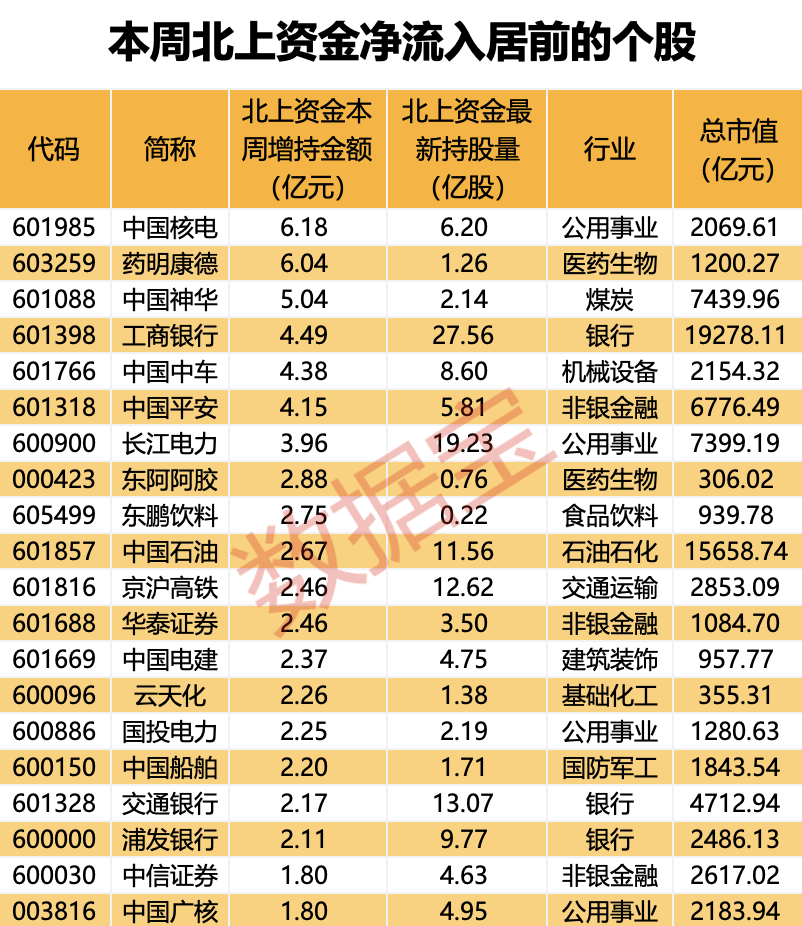 根据数据宝统计,本周北进45股净流入超过1亿元,中国核电,药明康德,中国神华净流入量居前,分别为6.18亿元、6.04亿元、5.04亿元。