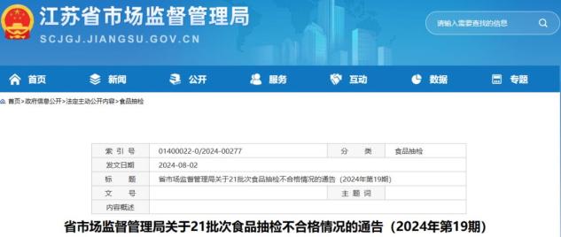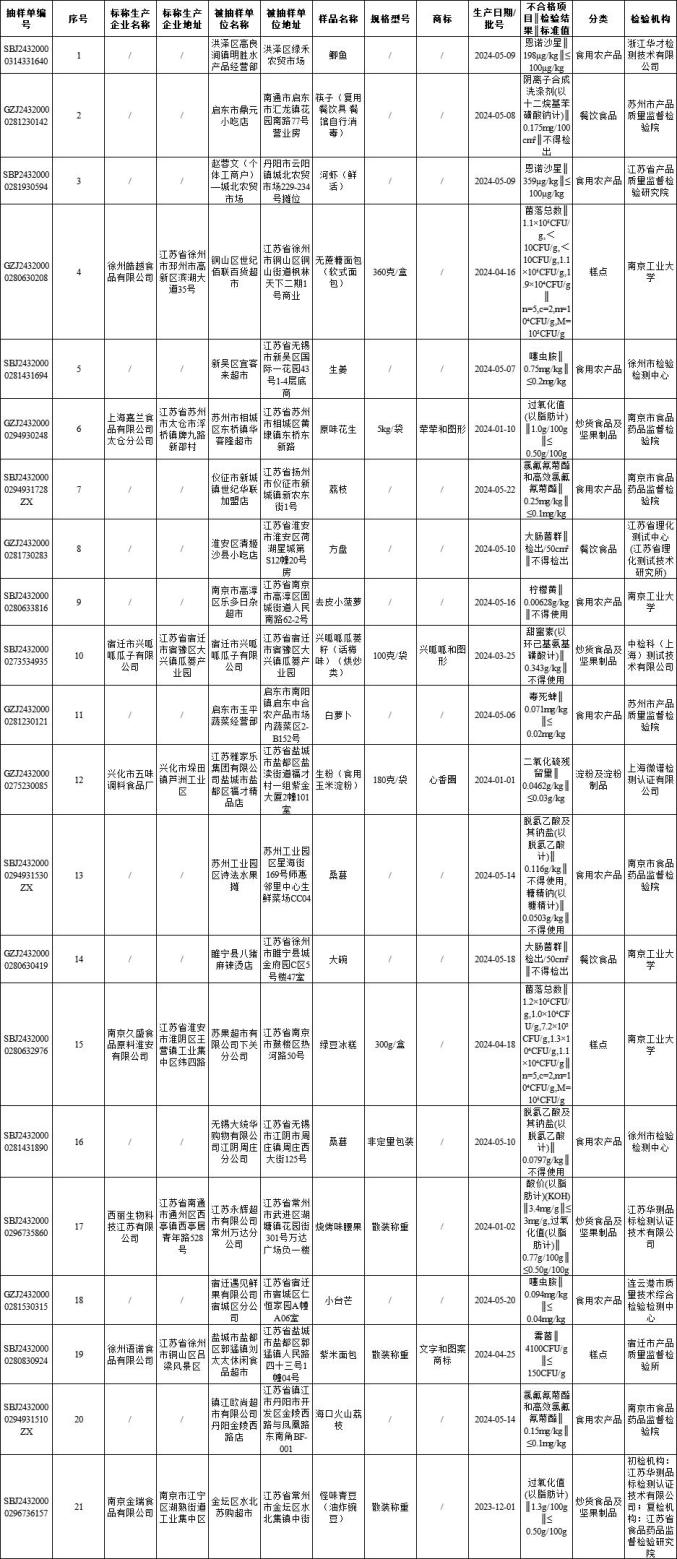 近日,江苏省市场监督管理局组织食品安全抽样,抽取18大类食品1073批样品,如红薯、油炸食品、糖块产品、水果制品、调味料、水产品、蔬菜制品、淀粉及淀粉制品、茶及相关产品、零食、粮食加工品、食用农产品、炒货食品及坚果制品、食用油及其制品、饮料、肉制品、冷冻食品和餐饮食品等。5大类食品21批样品不合格,包括餐饮食品、炒货食品和坚果制品、淀粉和淀粉制品、零食和食用农产品。