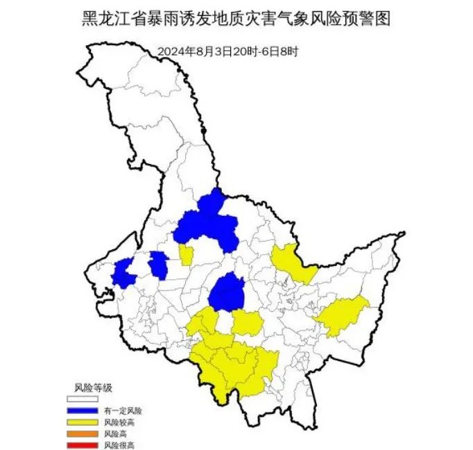 8月3日16:00,黑龙江省人民政府防汛抗旱指挥部办公室、黑龙江省水利厅、黑龙江省气象局联合发布中小河流洪水气候风险预警:预计8月3日20:00-6日8:00,中小河流洪水风险(黄色预警)发生在孙吴、五大连池、讷河、克山、克东、富裕、齐齐哈尔城区、依安、林甸、明水、木兰、通河、双城、五常、尚志、阿城、宝清。爱辉、嫩江、逊克、北安、泰来、碾子山、甘南、龙江、拜泉、杜蒙、大庆市、肇源、肇州、青冈、肇东、兰西、绥棱、海伦、安达、北林、庆安、望奎、萝北、绥滨、铁力、延寿、哈尔滨市、呼兰、宾县、巴彦、方正、海林都有一定的中小河流洪水(蓝色预警)的风险。在中小河洪水实时监测、防洪预警、检查防守、转移避险、抢险救援等方面,请在上述地区做好防范工作。