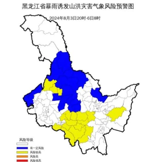 8月3日16时00分,黑龙江省防汛抗旱指挥部办公室、黑龙江省水利厅、黑龙江省气象局联合发布山洪气候风险黄蓝预警:预计8月3日20:00-6日8:00,呼兰、延寿、宾县、巴彦、方正、木兰、通河、依兰、双城、五常、尚志、阿城、讷河、克山、克东、海林、宝清等。爱辉、孙吴、五大连池、嫩江、逊克、北安、碾子山、甘南、龙江、拜泉、绥棱、海伦、庆安、望奎、萝北、铁力都有一定的气候风险(蓝色预警)。请密切关注天气情况和雨水情况的变化,加强分析判断,及时向有关乡镇、村发布预警信息,并按有关规定做好叫应工作。请密切关注天气情况和雨水情况的变化,加强分析判断,及时向相关乡镇村发布预警信息,按照相关规定做好应对工作。加强检查和排除危险,必要时提前组织危险地区群众转移,确保人民群众人身安全。