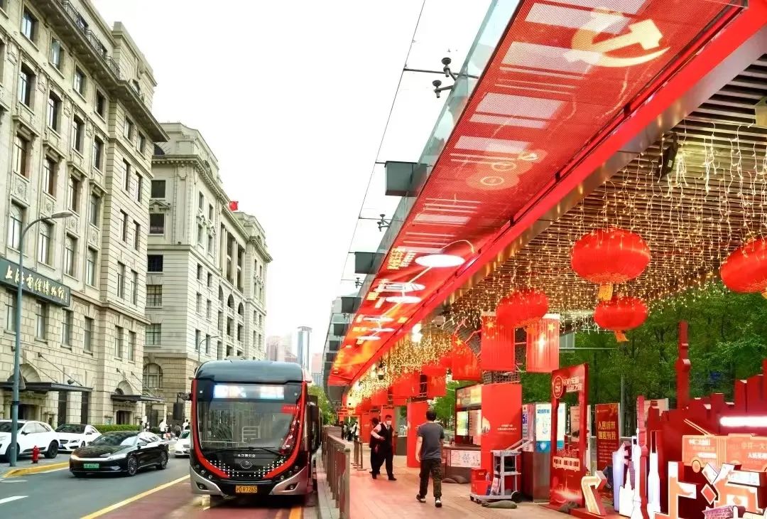 与传统公交车站相比,71路延安东路外滩站结合了简约时尚的感觉:时尚科技感的71路公交车、暗红色公交车专用车道、地铁式防护门、巨大的电子显示屏...所有这些都散射出上海的氛围和时尚。每到重大节日,它都会“打扮”,让每一位乘客都能感受到浓厚的节日气氛。