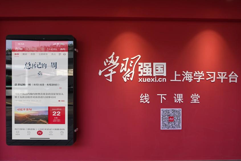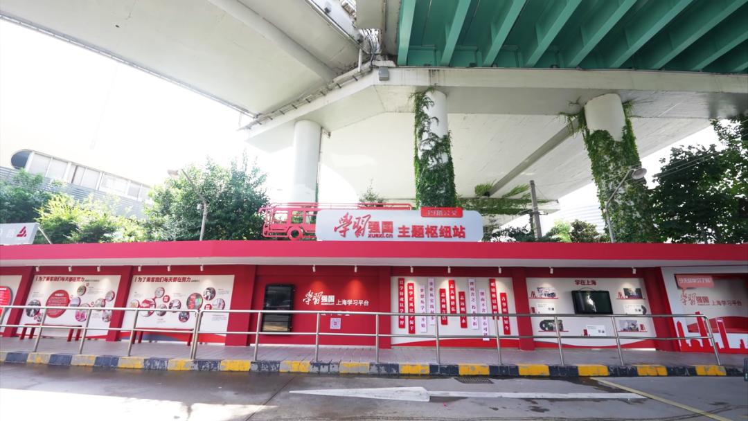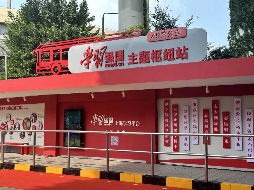 49路学习强国主题枢纽站作为上海第一个公交枢纽线下学习阵地,利用平台候车空间打造了一条全新的文化走廊,有机整合了景观、功能、文化等多重属性,使公交站不仅成为城市交通集中的地方,也成为学习理论的“加油站”。