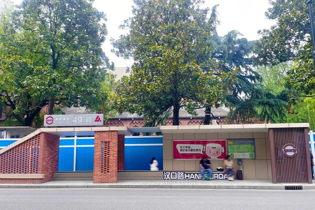 49路汉口路江西中路站周边有很多欧洲建筑。为了与周围环境相协调,车站采用了周边圣三一堂的红砖和外滩艺术馆立面的黄色花岗岩砖色调,运用传统建筑材料和现代简约的建筑造型,诠释了对复杂历史环境的尊重,充满了老上海的复古风格和文艺气质。