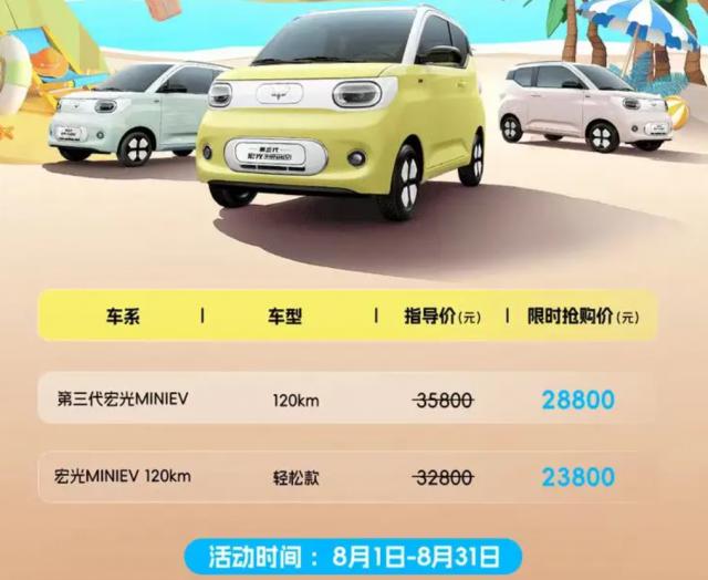 五菱宏光 MINIEV 推出 8 每月限时购车优惠政策,无上优惠 1.5 活动有效期为1万元 2024 年 8 月 1 日 -8 月 31 日本。优惠之后,宏光 MINIEV 120 公里轻松售价为 2.38 第三代宏光万元 MINIEV 120 公里型号的价格是 2.88 万元。