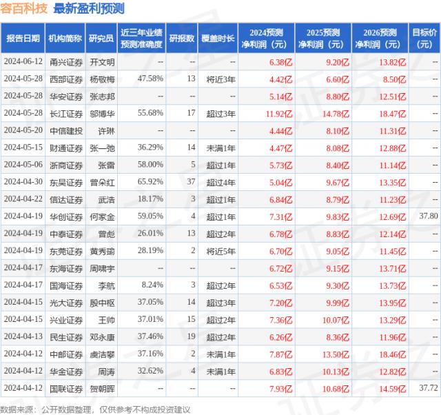 根据近三年发布的研究报告数据,东吴证券曾朵红研究员团队对该股进行了深入研究,近三年的预测准确度平均值为 预测65.92% 2024 年度归属净利润为利润 5.04 十亿,根据现价转换预测。 PE 为 21.39。