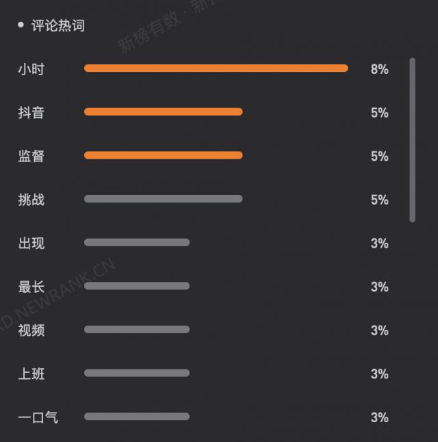 根据新抖的数据,这个视频总共有 2600 万条评论中,“小时”、“最长”、“视频”、“抖音”高频出现,“挑战”、“一口气”、“工作”、“监督”等与时长相关的词语也有。 3% 出现率。可以看出,这个视频最打动观众的点,正是它的时长。