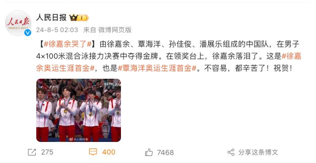 在男子4中,中国队由徐嘉余、海洋、孙佳俊、潘展乐组成,×100米混合泳接力决赛获得金牌。徐嘉余在领奖台上哭了。这是徐嘉余奥运会的第一枚金牌,也是海洋奥运会的第一枚金牌。