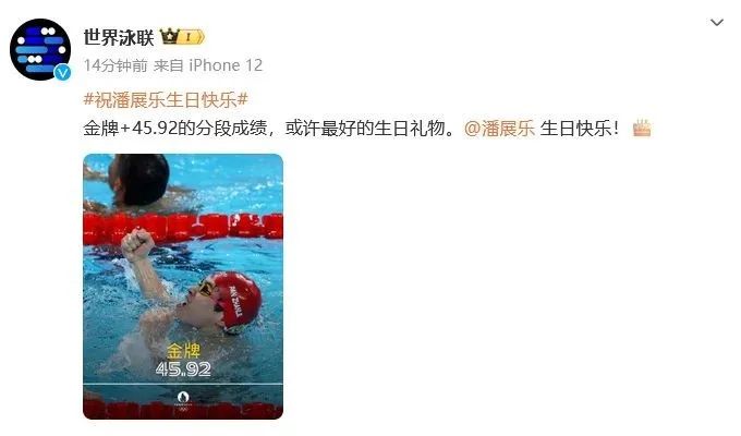 潘展乐生日夺金,世界泳联发文,祝潘展乐生日快乐:金牌 分段成绩45.92,或许是最好的生日礼物。@潘展乐生日快乐!