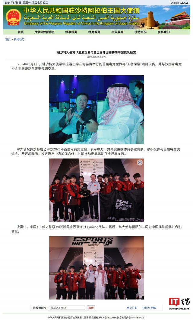 IT 世家 8 月 5 日消息,IT 世家从中国驻沙特大使馆官网获悉,首届电子竞技世界杯“王者荣耀”项目决赛在 8 月 4 日本举行,中国驻沙特使者常华受邀参加。常华使者表示,中国一直非常重视体育事业的发展,愿意积极参加第一届电子竞技奥运会。