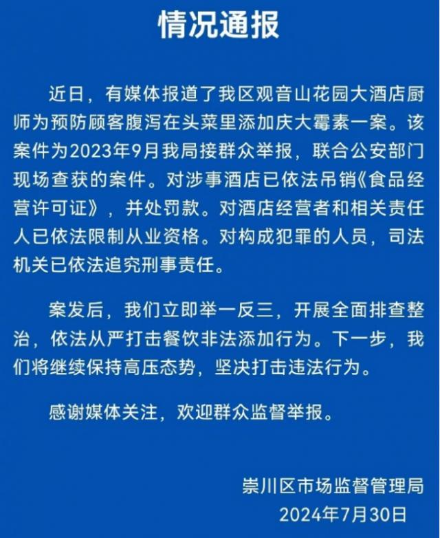 现在,官方已对酒店、酒店厨师进行了相应的处罚。