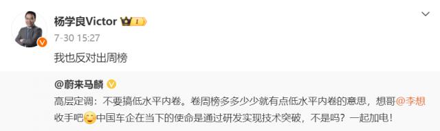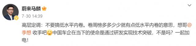 随后蔚来高管在微博上表示,发周榜是低水平内卷,并发话李想:想哥,停下来。