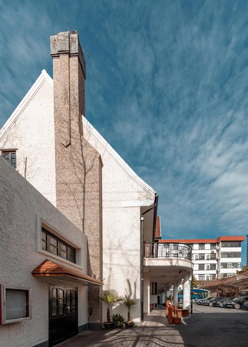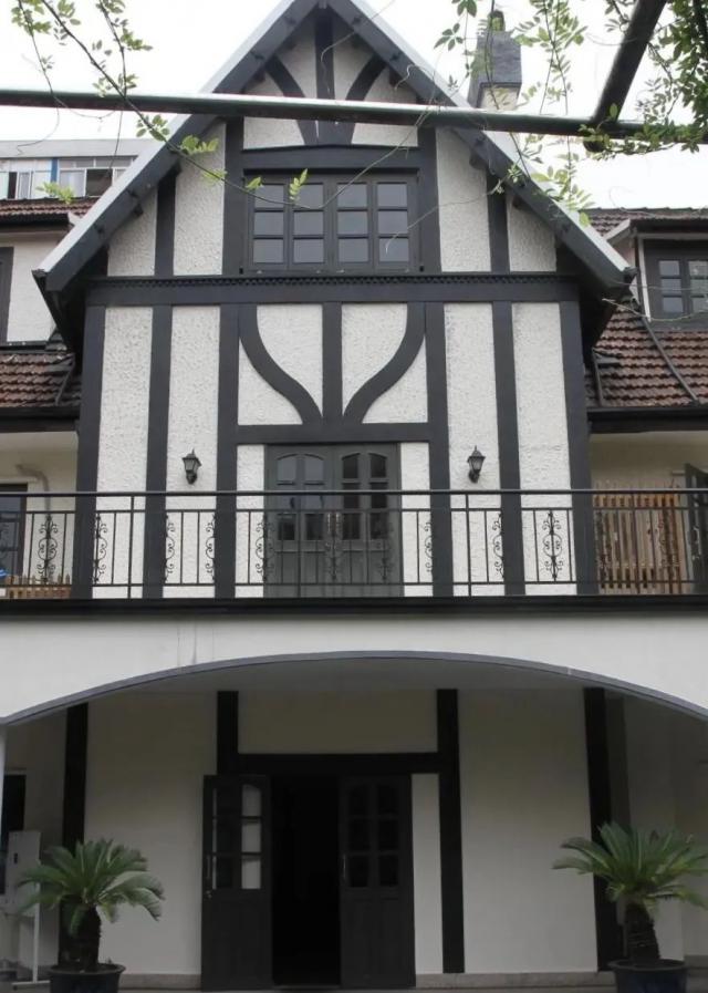 该建筑为砖木混合结构的花园住宅,具有明显的英国乡村别墅风格。整个建筑整体协调简洁,具有一定的层次感,呈现出优雅的氛围质感。双坡陡屋顶上部为人字形尖形和露明木框架。建筑主体平面呈矩形,构图对称,比例适宜。此外,细节装饰以几何形状为主,砖底角和线脚非常精致。
