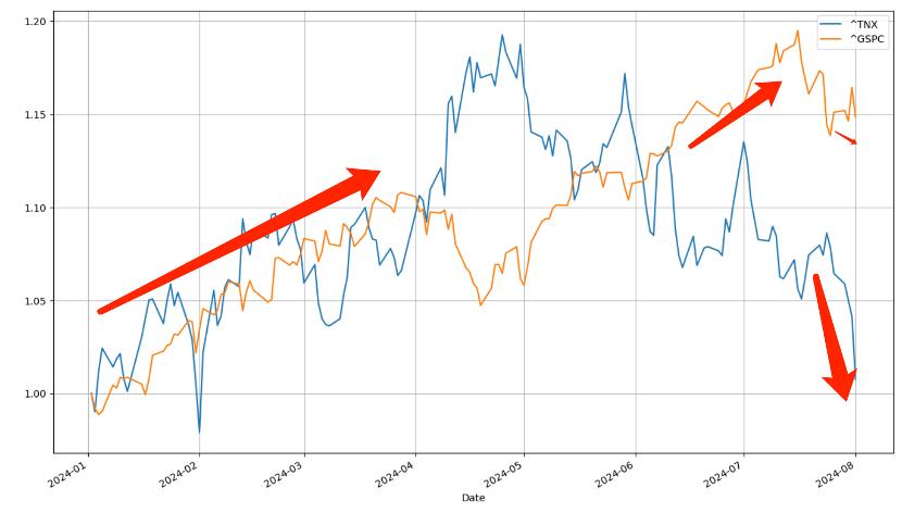 上图显示了2024年以来美国十年国债利率与标准普尔500指数的波动。大部分时间,两条曲线走势相对一致。比如2024年Q1两条曲线都涨了(债券市场的资金销售导致回报率上升,部分资金进入股市支撑美股)。然而,5月份以后,美国债券的收益率进入了下行通道。这时,大量资金开始流入美国债券,美股短期内只有一点起伏。在7月中旬之前,它一直保持着高涨的趋势。