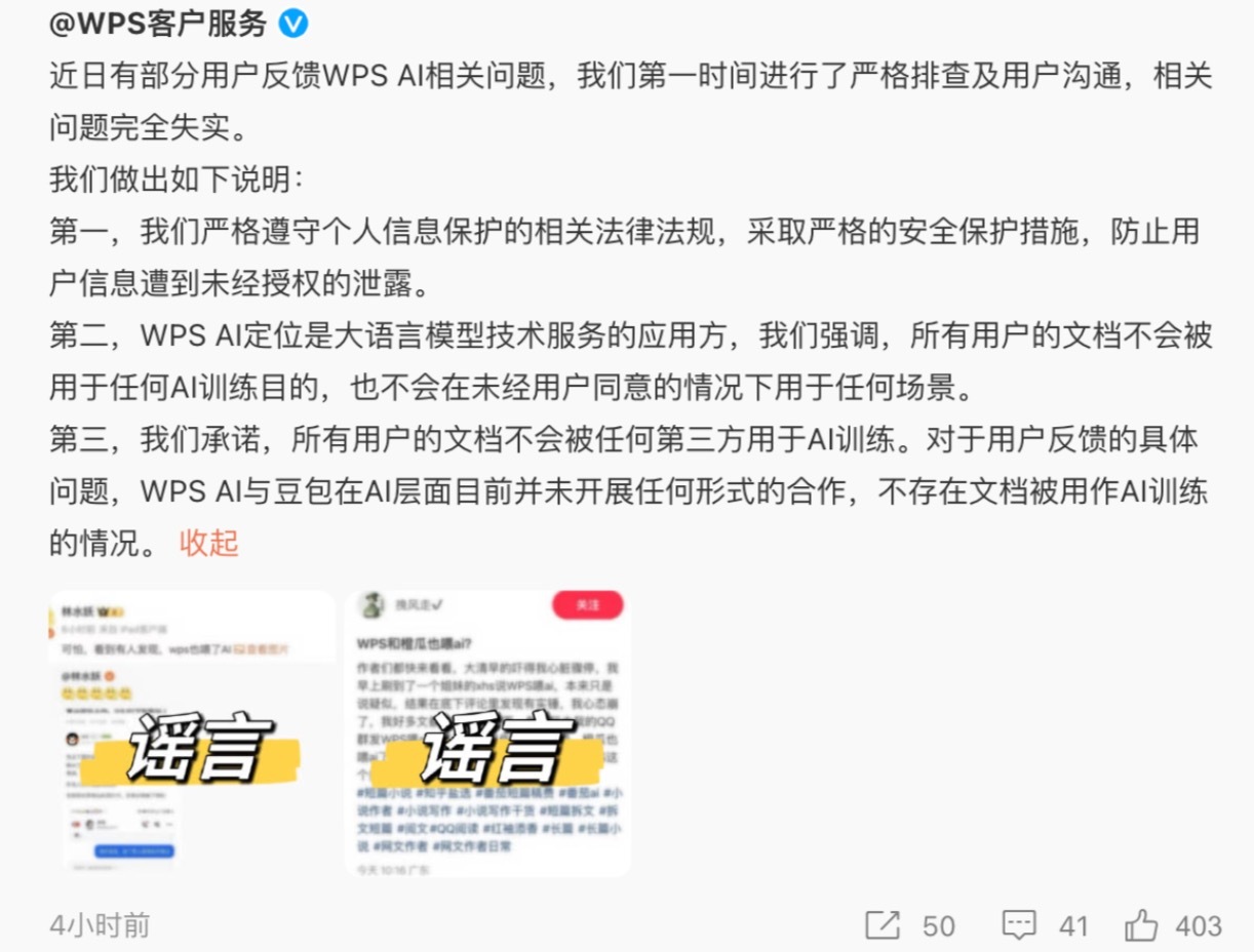WPS官方服务号迅速发布微博辟谣,主要信息有两点: