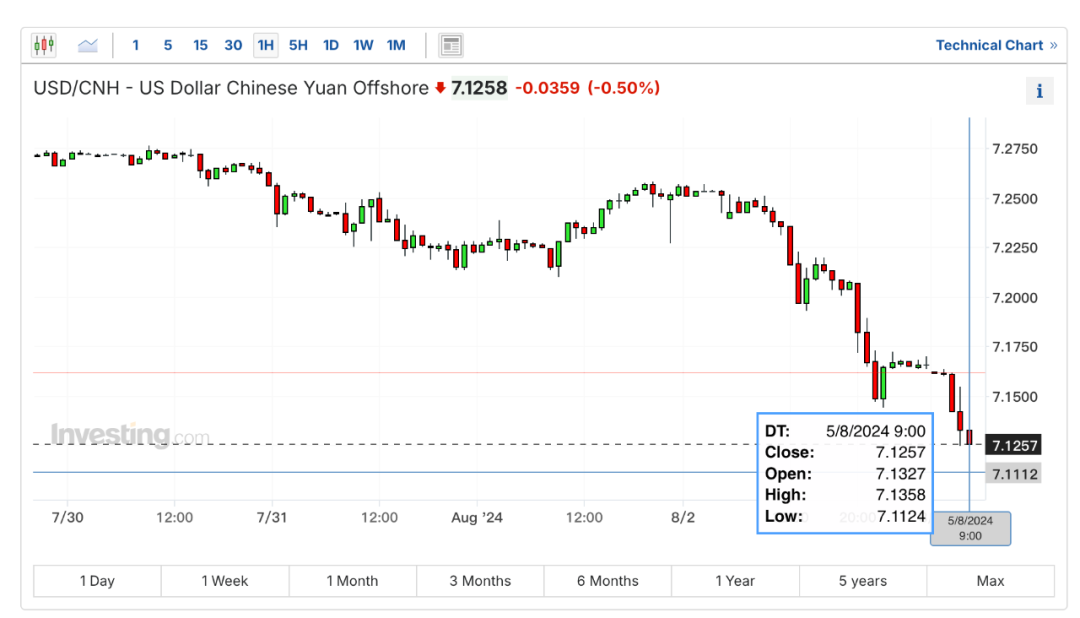离岸人民币汇率在上周五暴涨1000点后再次暴涨近500点,一度达到7.12,至7.1124。现在已经恢复到7.13左右。