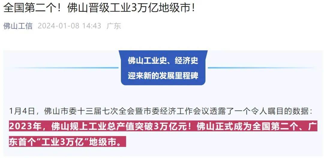 佛山的产业非常强大。2022年工业增长值位居全国第六。2023年,佛山工业产值超过3万亿元,仅次于深圳、苏州、上海,成为工业产值第四城。