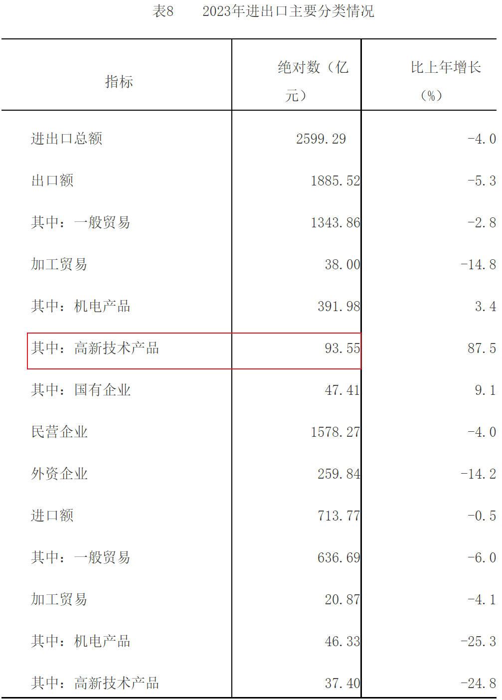 泉州2023年出口价值1885.52亿元,下降5.3%。在这些产品中,高新技术产品出口93.55亿元,仅占出口价值的4.96%。