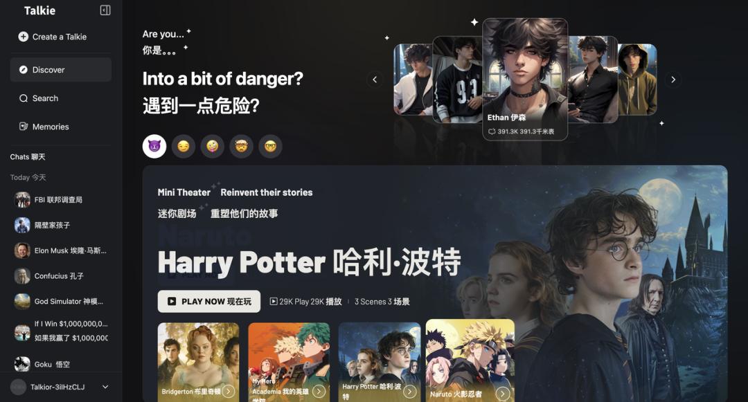 和马斯克聊得很开心,和詹姆斯笑着骂着,甚至和《哈利波特》里的赫敏学习法术。目前,这种破维度墙的对话被称为 Talkie 的 AI 把产品变成现实。