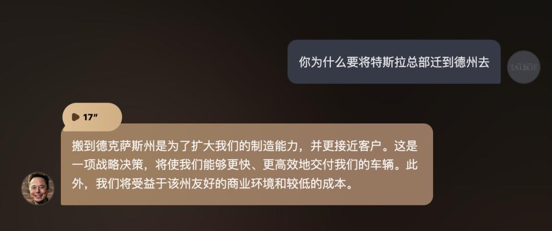 比如我问「马斯克」为什麽要将特斯拉总部迁往德州,他会有条不紊地回答: