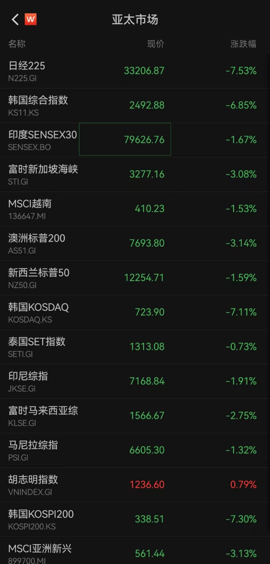 另外,日本东证银行股指下跌超过12%、日本10年期国债收益率下降17个基点至4月至今,日本国债期货触发熔断机制,三菱日联银行日内跌幅创历史新低,韩国、澳大利亚等国股市也一路走低。