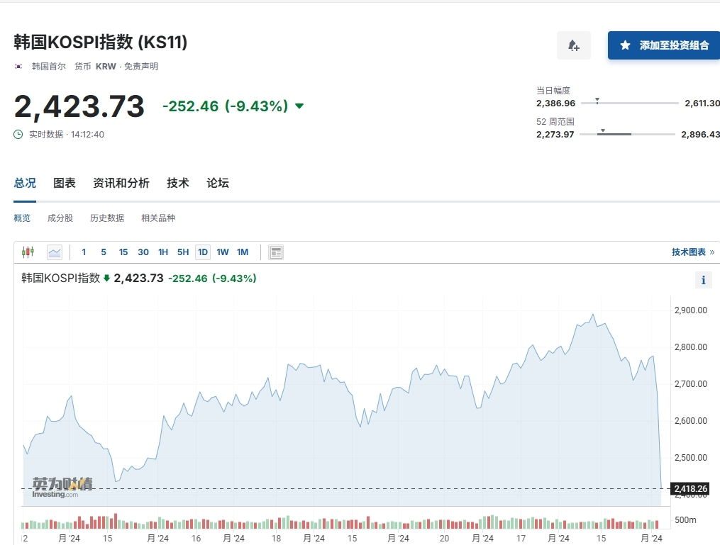 在触发熔断机制的情况下,韩国KOSPI指数一度下跌至10%。