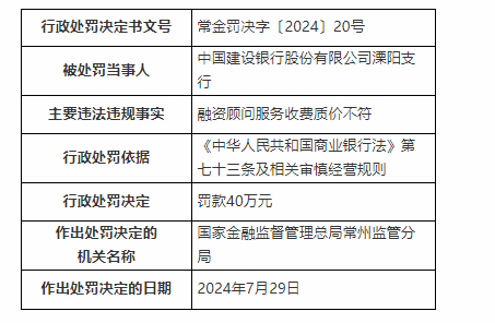 建设银行溧阳支行因融资顾问服务费质量不一致,被罚款40万元。