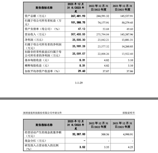 招股书显示,2020-2023年,一连科技营业收入分别为6.99亿元、14.34亿元、27.58亿元和30.75亿元;归母净利润分别为6560.22万元、1.43亿元、2.36亿元和2.60亿元;非归母净利分别为5360.65万元、1.39亿元、2.20亿元和2.50亿元。