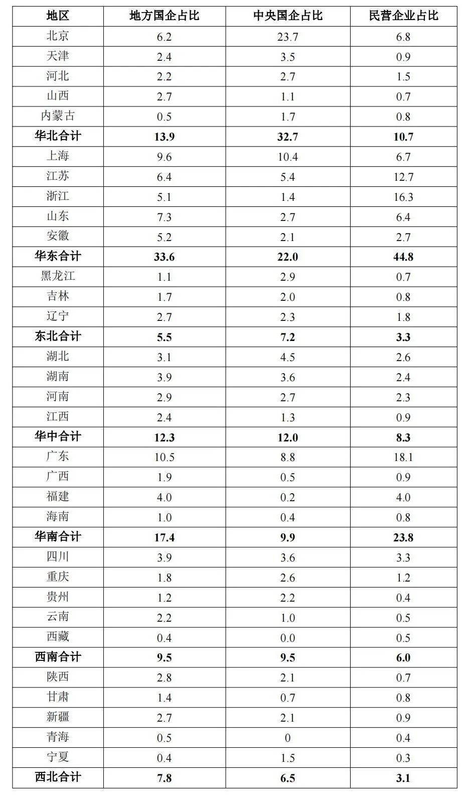附表1 不同所有制企业样本区域分布比例(%)