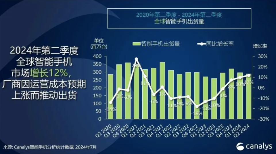 根据市场调查机构Canalys发布的最新报告,2024年第二季度全球智能手机市场出货量达到2.889亿台,同比增长12%。智能手机行业连续三个季度的增长,可以算是让手机厂商松了一口气,从衰落到增长,代表了很多。