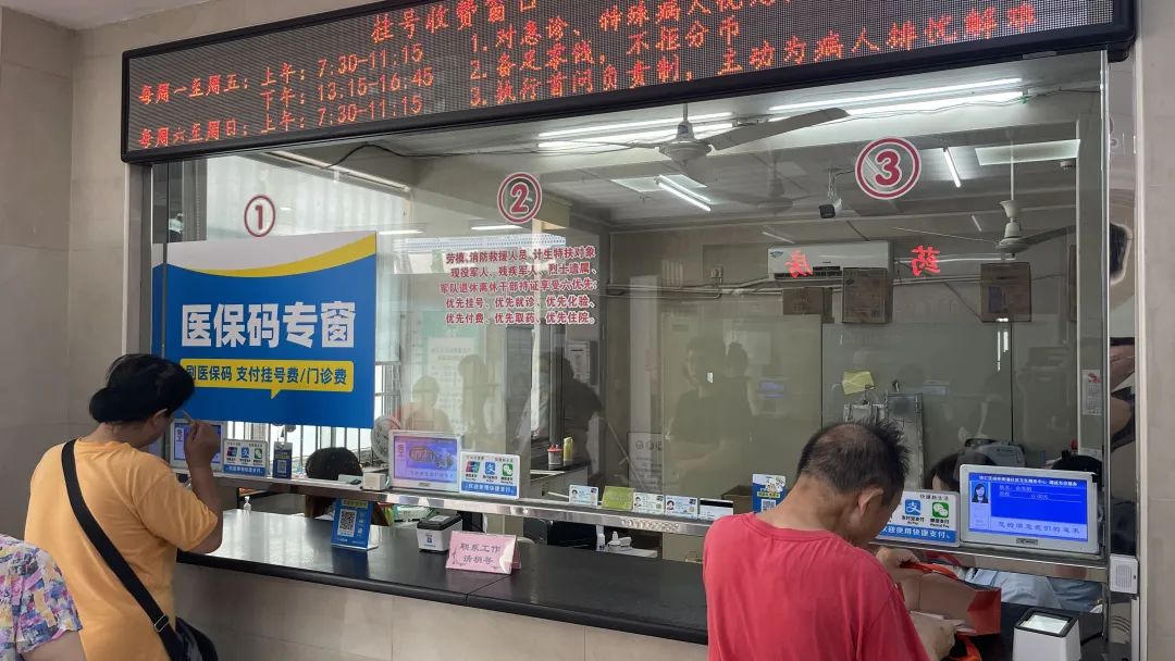 在徐汇区田林街道社区卫生服务中心门诊大厅,挂号收费窗口贴有显眼的医保码专用窗口标志,提示患者可以使用电子医保。还有志愿者指导患者,通过医保码关联,选择部门,提交信息,轻松完成挂号支付。