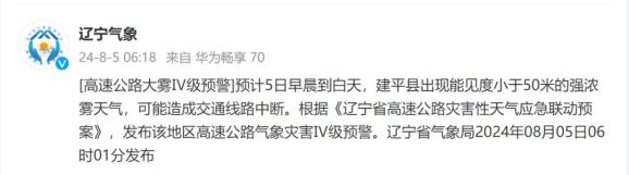 2024年8月5日05时48分,朝阳建平县气象台发布浓雾红预警