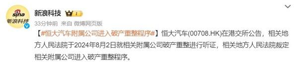 恒大汽车发布公告 有关附属公司进入破产重整程序