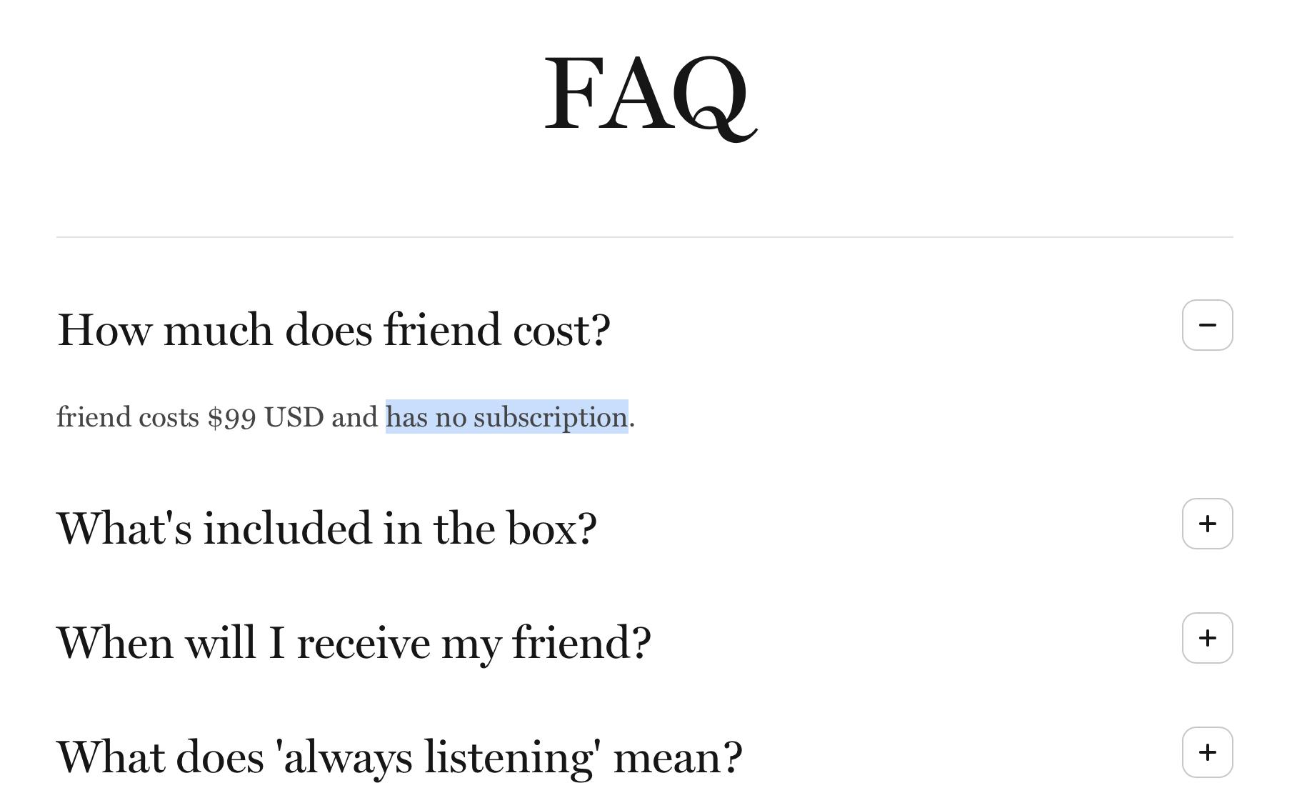 此外,不提供订阅服务也意味着不提供订阅服务 friend 一定要靠 99 为了维持后续的商业运作,美元的硬件价格。