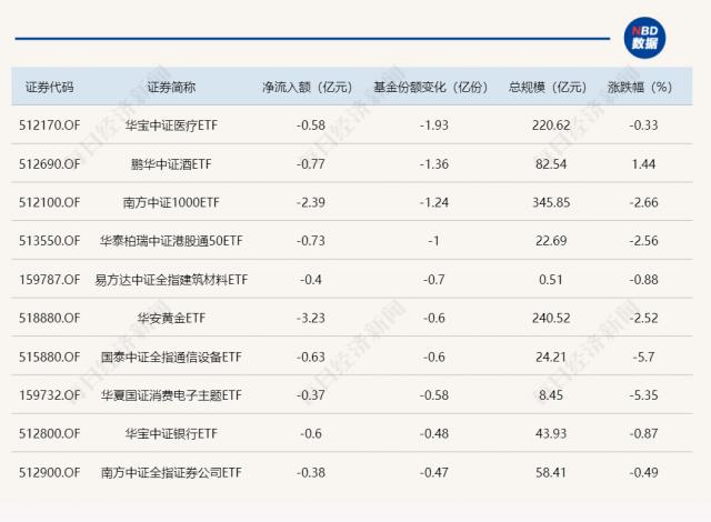 同时,华宝中证医疗 ETF 基金认购减少了 1.93 一一一亿份,净流出额为 0.58 亿元;鹏华中证酒 ETF 基金认购减少了 1.36 一一一亿份,净流出额为 0.77 十亿元;南方中证 1000ETF 基金认购减少了 1.24 一一一亿份,净流出额为 2.39 亿元。