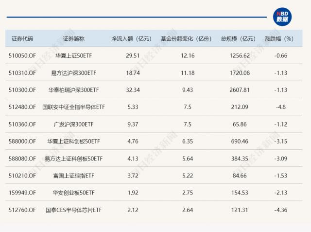 Wind 数据显示,是的 8 月 5 日的非货币 ETF 华夏上证在市场上 50ETF 基金认购得到加强 12.16 十亿份,净流入额为 29.51 亿元;沪深易方达 300ETF 基金认购得到加强 11.18 亿份,净流入额为 18.74 亿元;华泰柏瑞沪深 300ETF 基金认购得到加强 9.43 十亿份,净流入额为 32.34 一亿元,是当天净流入最大的单个商品。